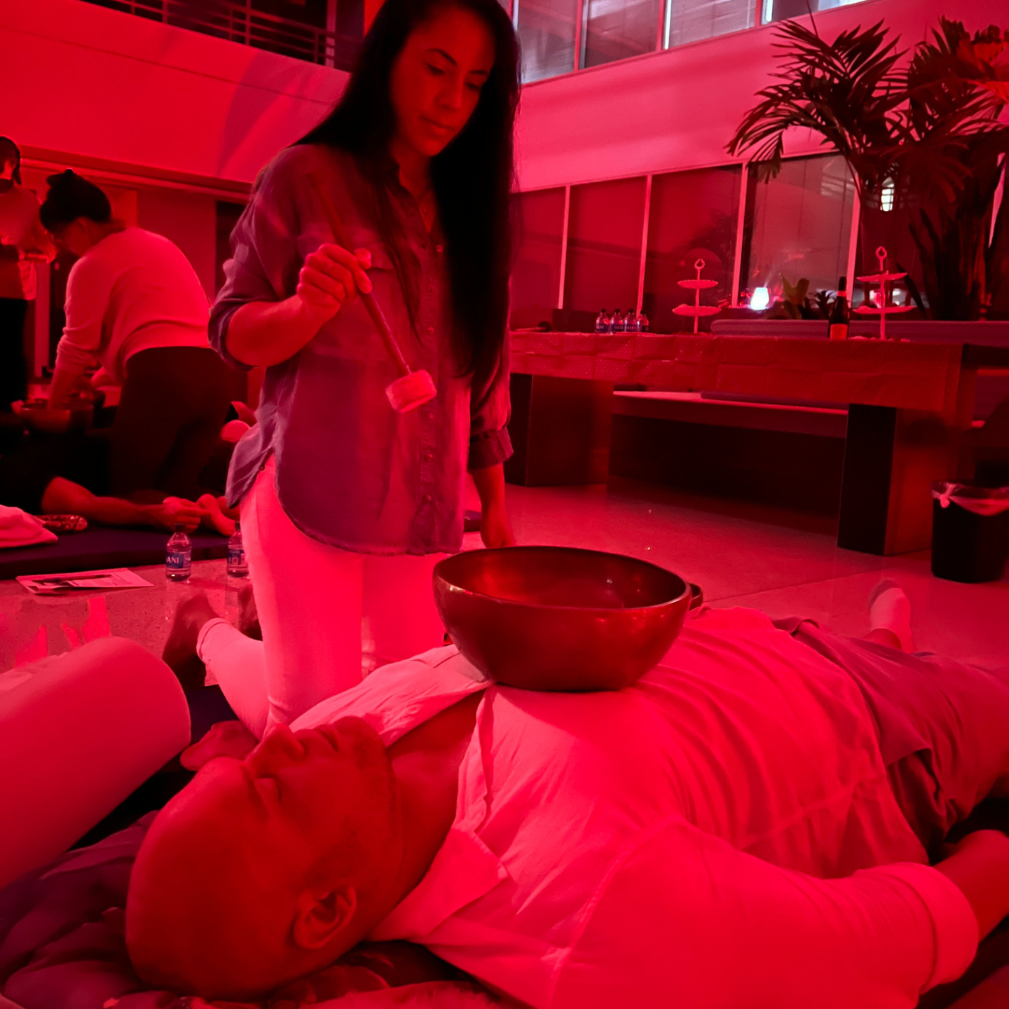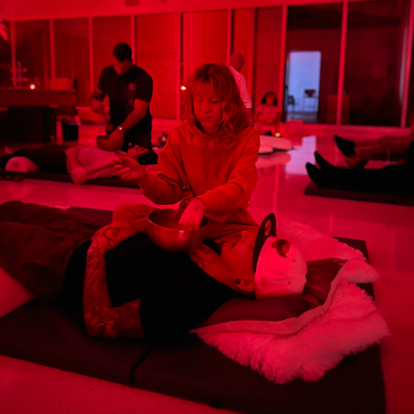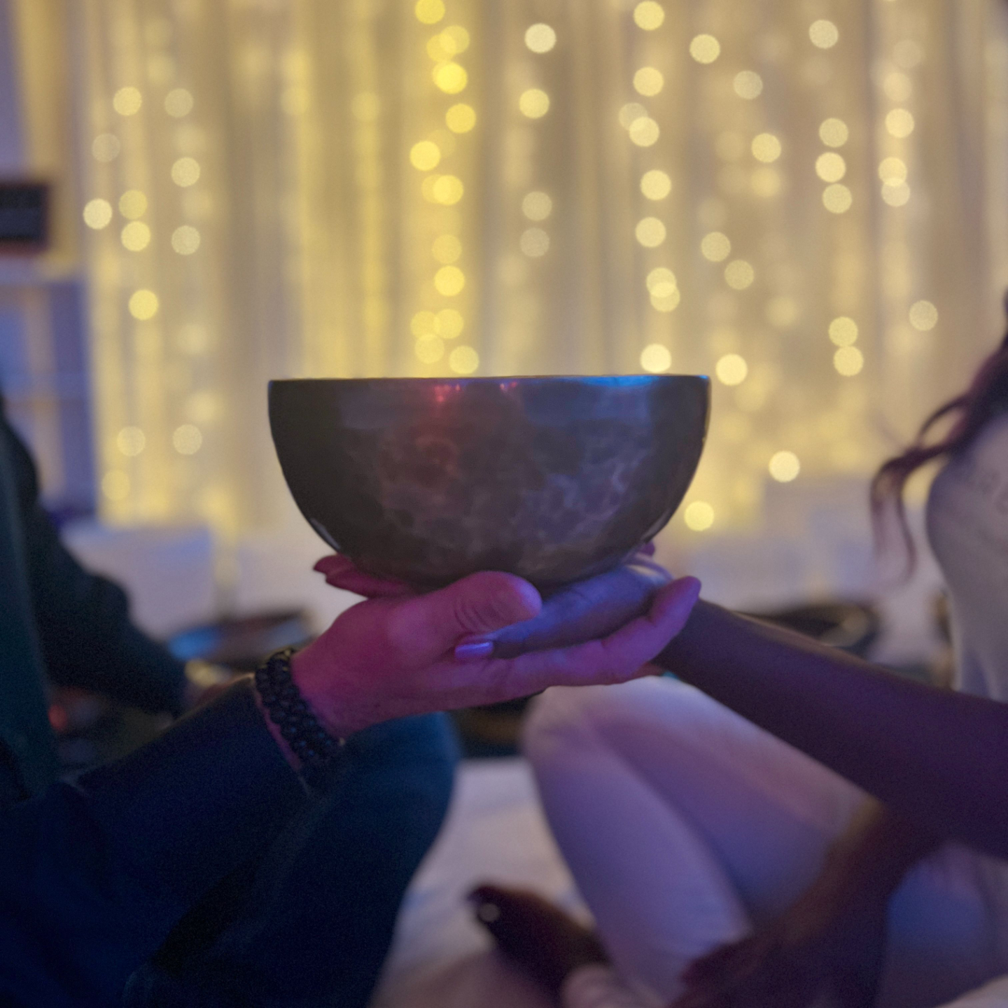 Even without hands-on touch, placing bowls on the body engages the nervous system.